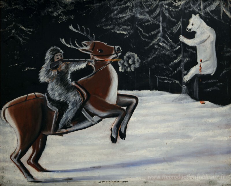 Nous vous proposons une reproduction artisanale sur toile du célèbre tableau 'Emut de la rivière à Tungus' de Niko Pirosmani, provenant du Musée de la Reproduction.