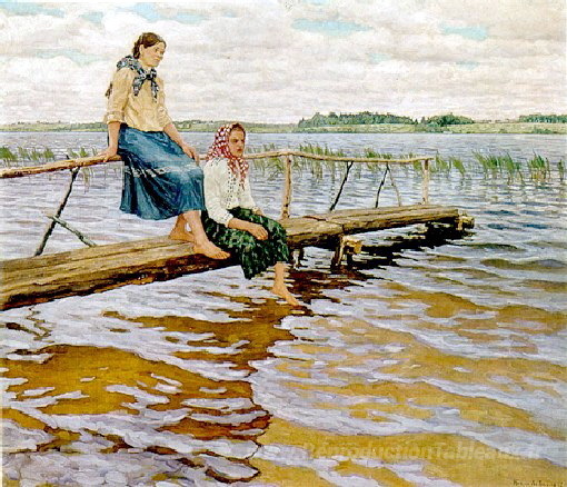 Nous vous proposons une reproduction artisanale sur toile du célèbre tableau 'En attendant le ferry' de Nikolay Bogdanov-Belsky, provenant du Musée de la Reproduction.