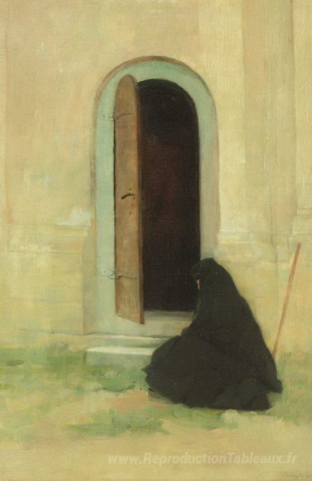 Nous vous proposons une reproduction artisanale sur toile du célèbre tableau 'En attendant' de Constantin Artachino, provenant du Musée de la Reproduction.