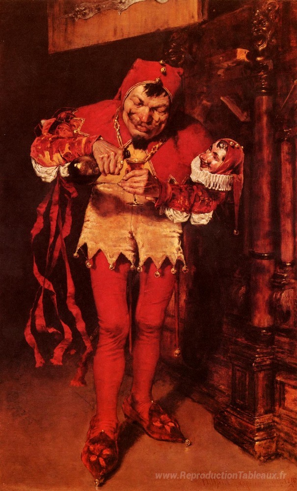Nous vous proposons une reproduction artisanale sur toile du célèbre tableau 'En train de s'acquitter, le bouffon de la cour' de William Merritt Chase, provenant du Musée de la Reproduction.