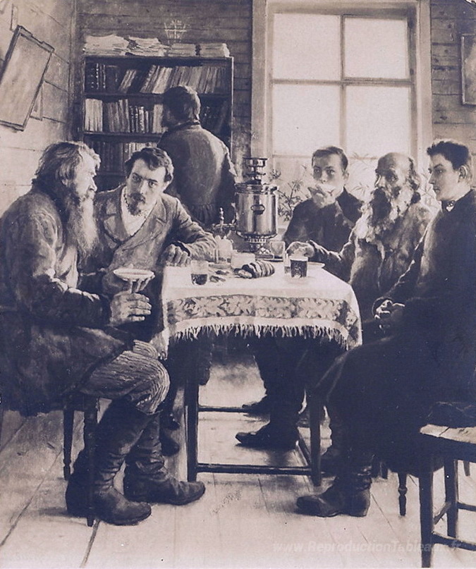 Nous vous proposons une reproduction artisanale sur toile du célèbre tableau 'En visite au professeur' de Nikolay Bogdanov-Belsky, provenant du Musée de la Reproduction.