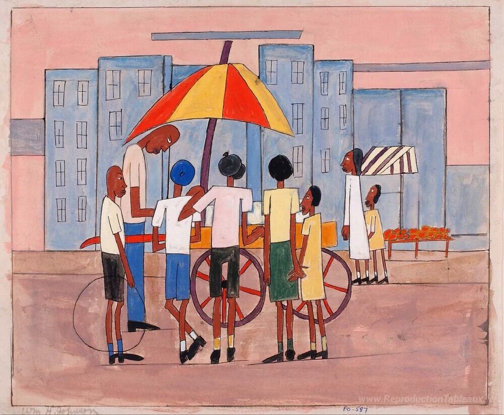 Nous vous proposons une reproduction artisanale sur toile du célèbre tableau 'Enfants à Ice Cream Stand' de William H. Johnson, provenant du Musée de la Reproduction.