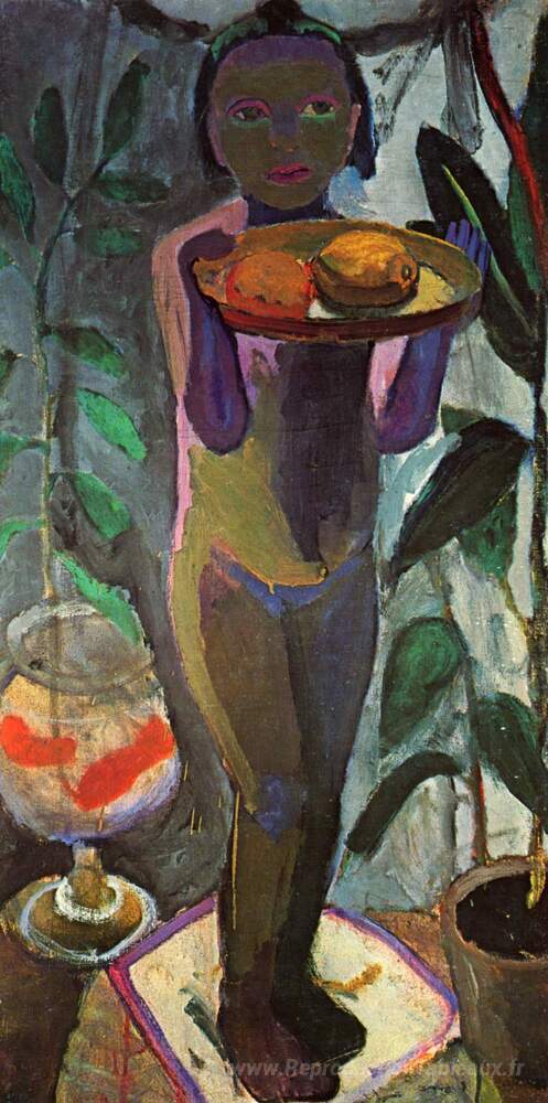 Nous vous proposons une reproduction artisanale sur toile du célèbre tableau 'Enfants avec bol de poisson rouge' de Paula Modersohn-Becker, provenant du Musée de la Reproduction.