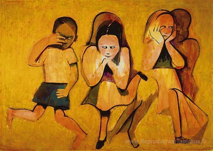 Nous vous proposons une reproduction artisanale sur toile du célèbre tableau 'Enfants qui jouent' de Charles Blackman, provenant du Musée de la Reproduction.