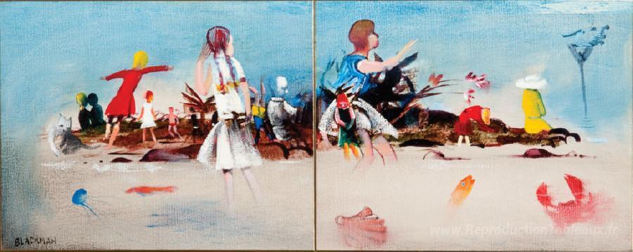 Nous vous proposons une reproduction artisanale sur toile du célèbre tableau 'Enfants sur la plage' de Charles Blackman, provenant du Musée de la Reproduction.