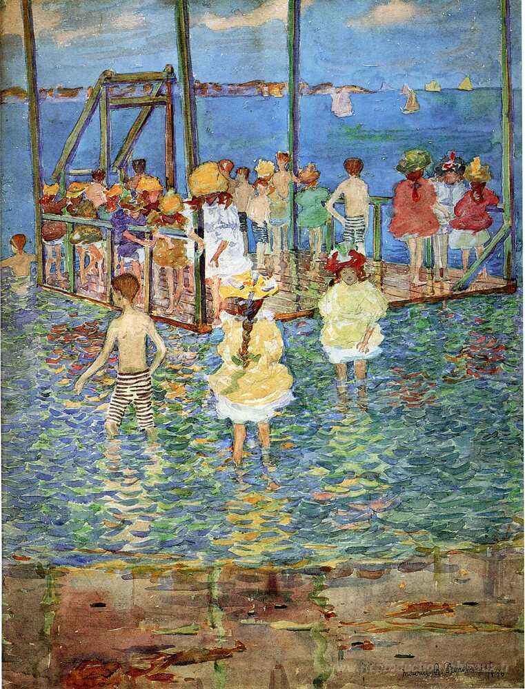 Nous vous proposons une reproduction artisanale sur toile du célèbre tableau 'Enfants sur un radeau' de Maurice Prendergast, provenant du Musée de la Reproduction.