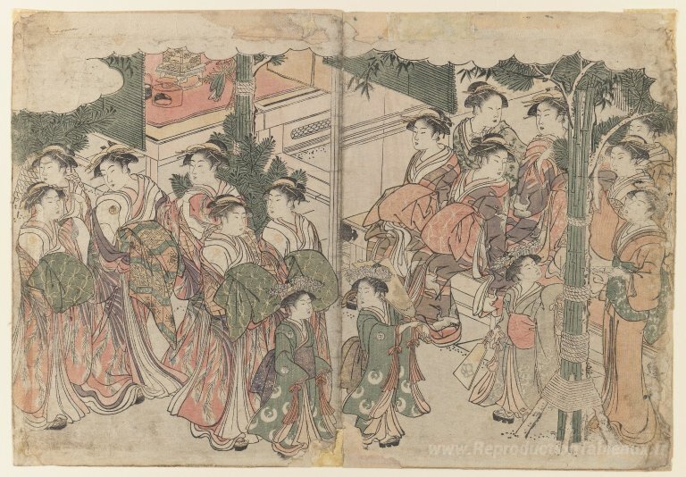 Nous vous proposons une reproduction artisanale sur toile du célèbre tableau 'Entourage de la courtisan au Festival du Nouvel An' de Kitagawa Utamaro, provenant du Musée de la Reproduction.