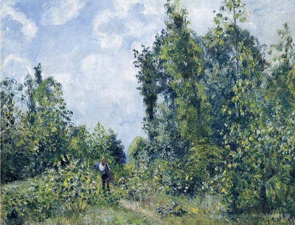 Nous vous proposons une reproduction artisanale sur toile du célèbre tableau 'Errant près du bois' de Camille Pissarro, provenant du Musée de la Reproduction.