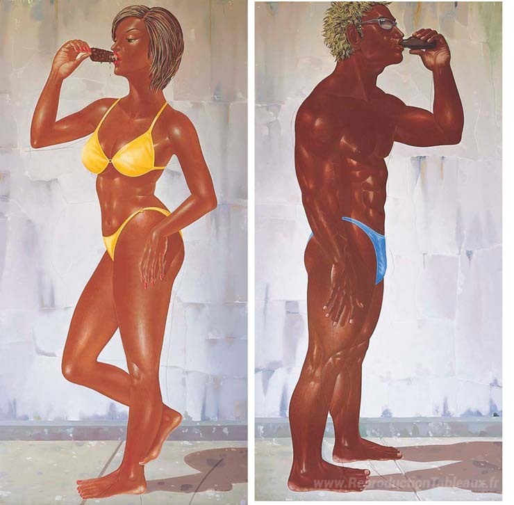 Nous vous proposons une reproduction artisanale sur toile du célèbre tableau 'ES Krim Dan Minuman Berengiri (glace et boisson énergisante)' de Nyoman Masriadi, provenant du Musée de la Reproduction.