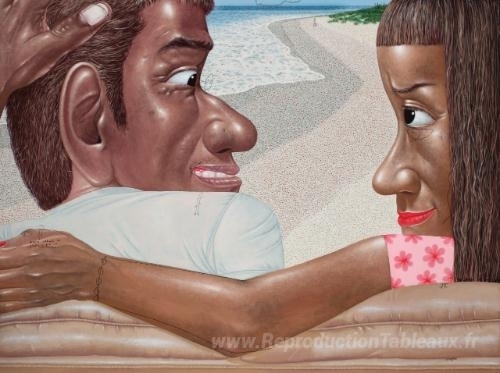 Nous vous proposons une reproduction artisanale sur toile du célèbre tableau 'Es-tu sûr?' de Nyoman Masriadi, provenant du Musée de la Reproduction.