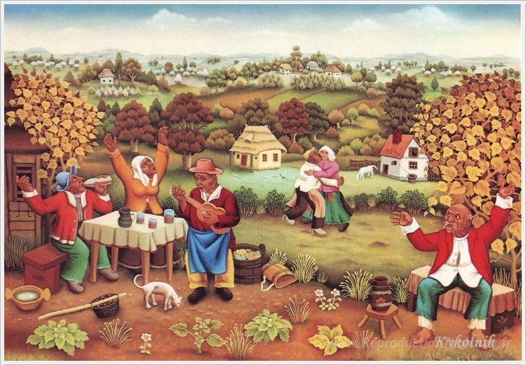 Nous vous proposons une reproduction artisanale sur toile du célèbre tableau 'Fête à Vineyard' de Ivan Generalic, provenant du Musée de la Reproduction.