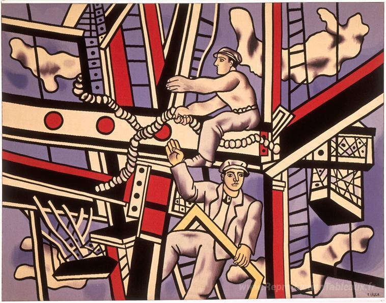 Nous vous proposons une reproduction artisanale sur toile du célèbre tableau 'Fabricants sur fond bleu' de Fernand Leger, provenant du Musée de la Reproduction.