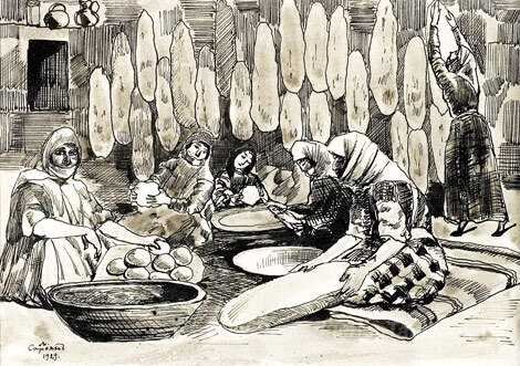 Nous vous proposons une reproduction artisanale sur toile du célèbre tableau 'Faire du pain' de Martiros Saryan, provenant du Musée de la Reproduction.
