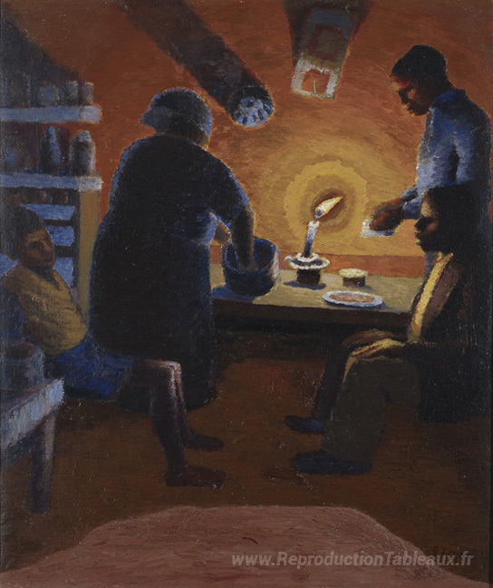 Nous vous proposons une reproduction artisanale sur toile du célèbre tableau 'Famille avec bougie' de Gerard Sekoto, provenant du Musée de la Reproduction.