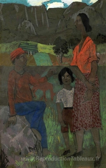 Nous vous proposons une reproduction artisanale sur toile du célèbre tableau 'Famille' de Grégoire Michonze, provenant du Musée de la Reproduction.