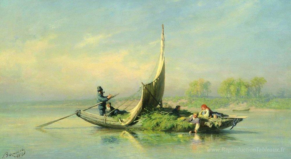 Nous vous proposons une reproduction artisanale sur toile du célèbre tableau 'Famille paysanne dans un bateau' de Fyodor Vasilyev, provenant du Musée de la Reproduction.