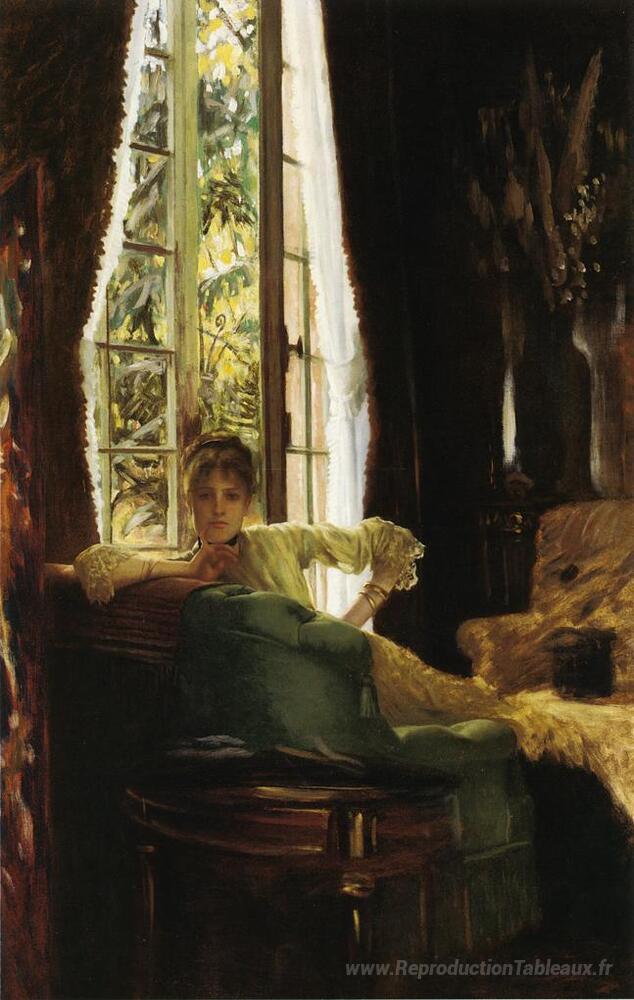 Nous vous proposons une reproduction artisanale sur toile du célèbre tableau 'Femme à l'intérieur' de James Tissot, provenant du Musée de la Reproduction.