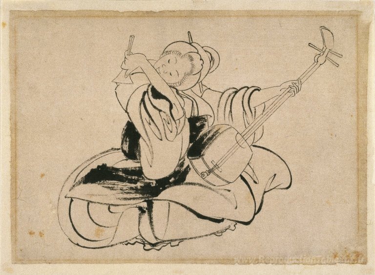 Nous vous proposons une reproduction artisanale sur toile du célèbre tableau 'Femme assise avec shamisen' de Katsushika Hokusai, provenant du Musée de la Reproduction.