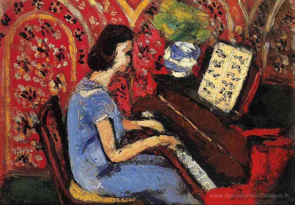 Nous vous proposons une reproduction artisanale sur toile du célèbre tableau 'Femme au piano' de Henri Matisse, provenant du Musée de la Reproduction.