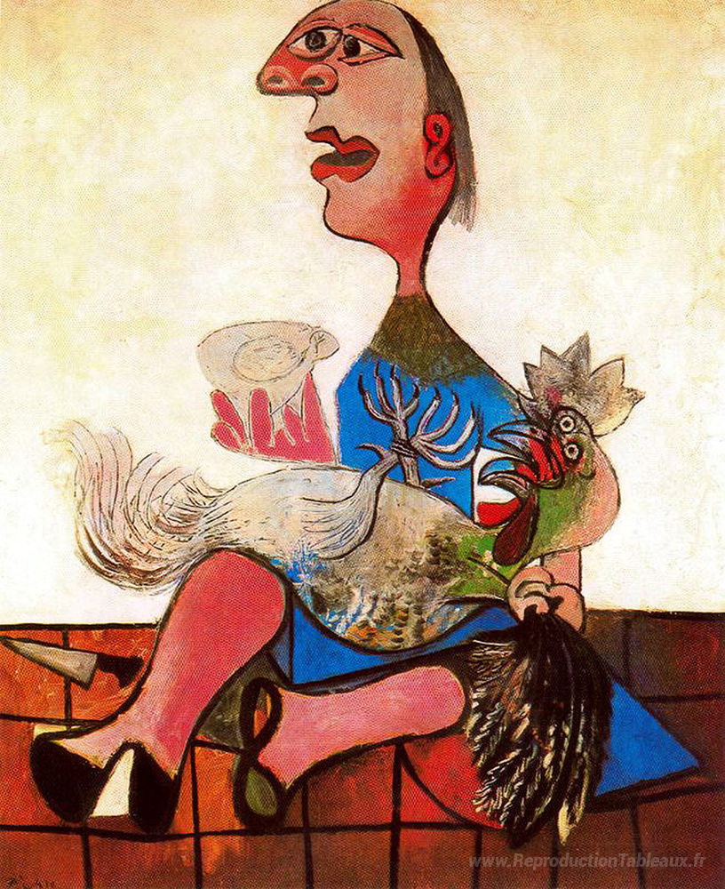 Nous vous proposons une reproduction artisanale sur toile du célèbre tableau 'Femme avec du coq' de Pablo Picasso, provenant du Musée de la Reproduction.