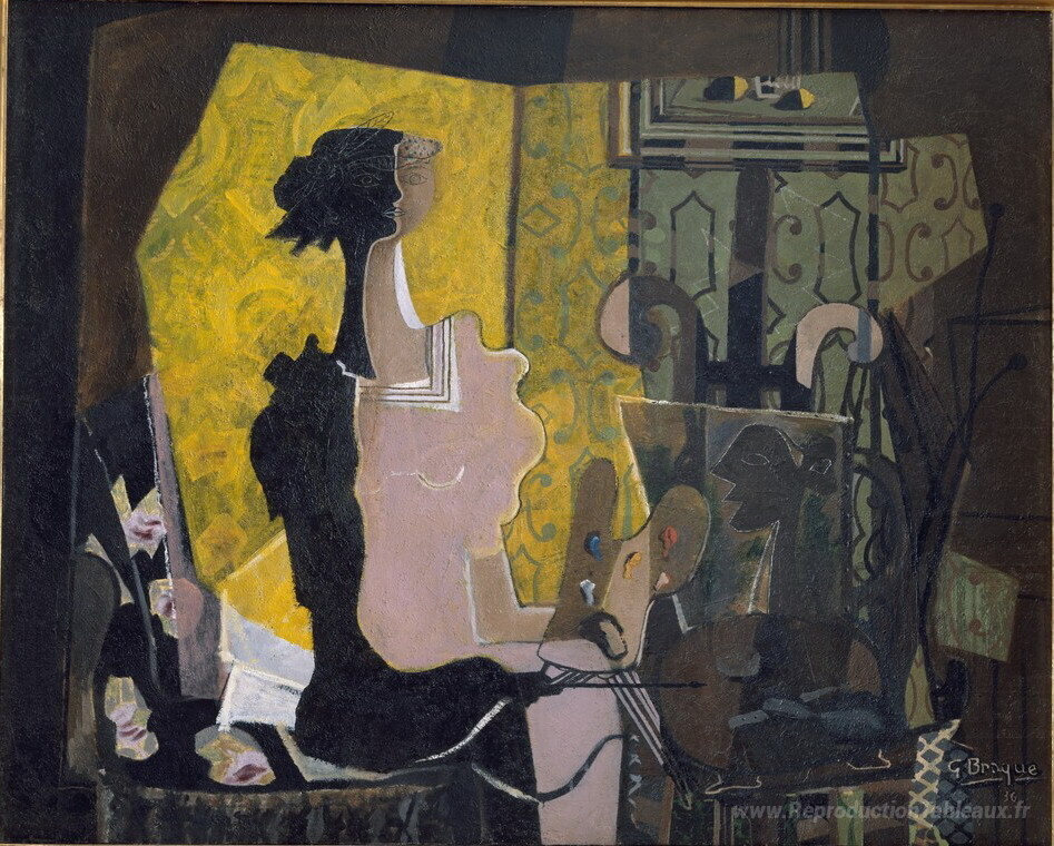Nous vous proposons une reproduction artisanale sur toile du célèbre tableau 'Femme avec le chevalet' de Georges Braque, provenant du Musée de la Reproduction.