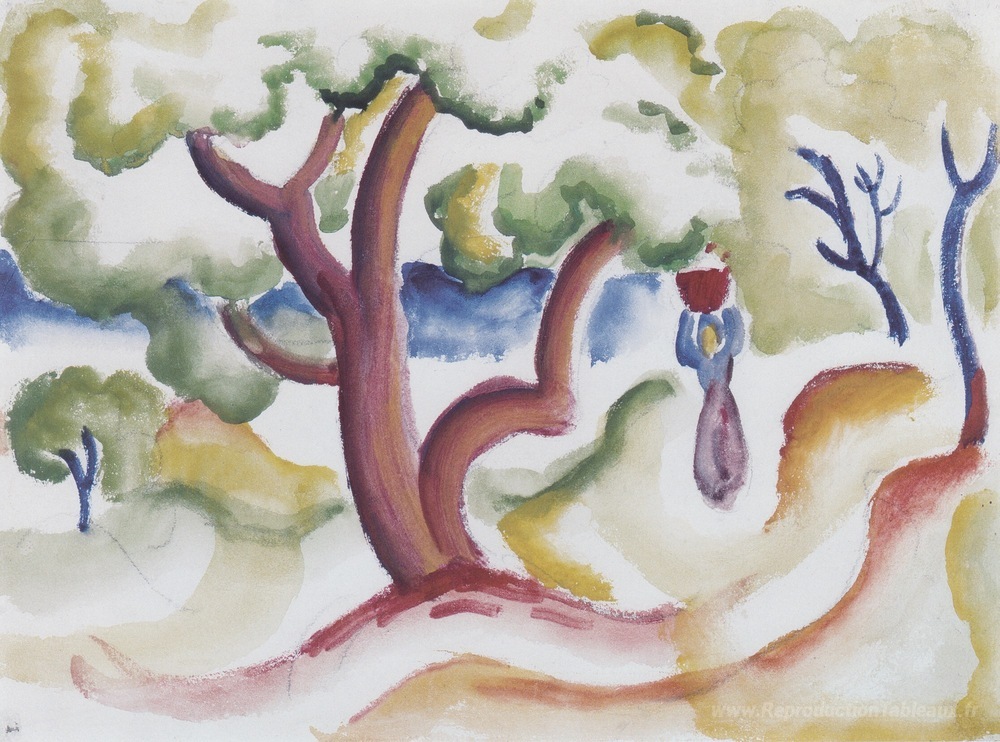 Nous vous proposons une reproduction artisanale sur toile du célèbre tableau 'Femme avec pichet sous les arbres' de August Macke, provenant du Musée de la Reproduction.