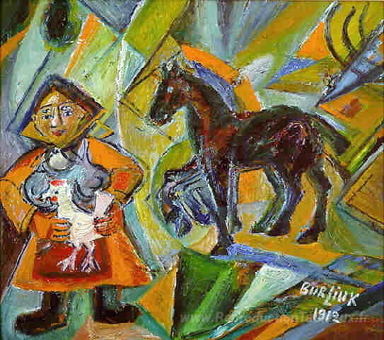 Nous vous proposons une reproduction artisanale sur toile du célèbre tableau 'Femme avec quatre yeux et poule' de David Burliuk, provenant du Musée de la Reproduction.