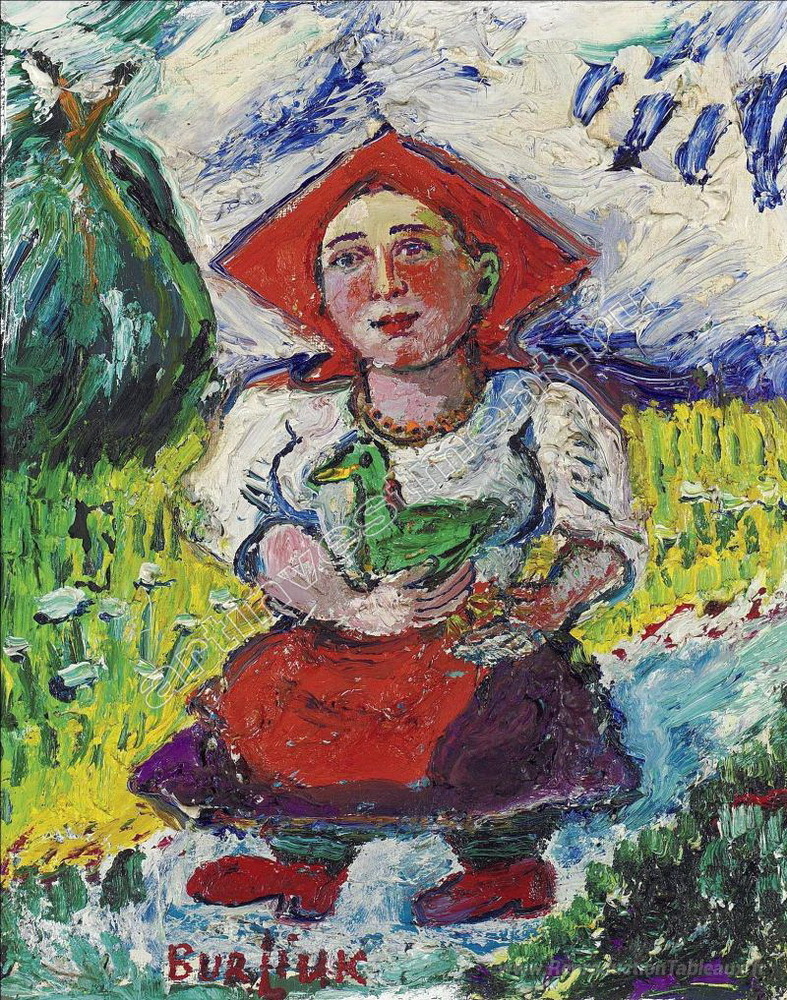 Nous vous proposons une reproduction artisanale sur toile du célèbre tableau 'Femme avec un canard' de David Burliuk, provenant du Musée de la Reproduction.