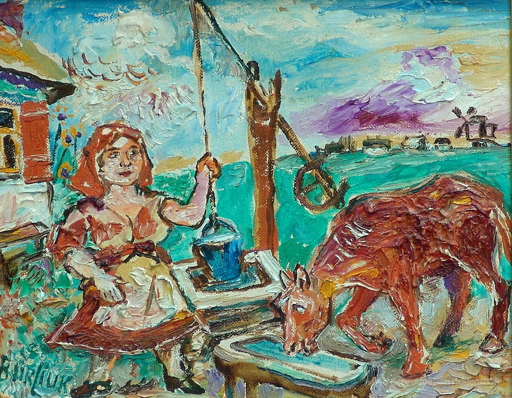 Nous vous proposons une reproduction artisanale sur toile du célèbre tableau 'Femme avec une vache rouge' de David Burliuk, provenant du Musée de la Reproduction.