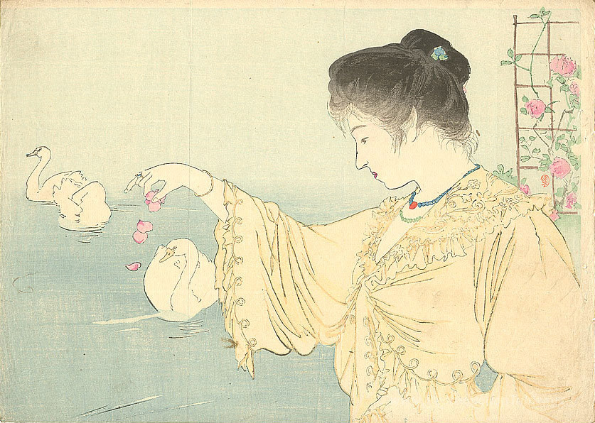 Nous vous proposons une reproduction artisanale sur toile du célèbre tableau 'Femme et cygnes blancs' de Kiyokata Kaburagi, provenant du Musée de la Reproduction.