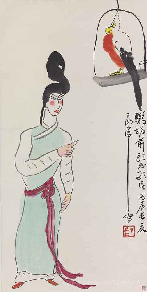 Nous vous proposons une reproduction artisanale sur toile du célèbre tableau 'Femme et perroquet' de Ding Yanyong, provenant du Musée de la Reproduction.