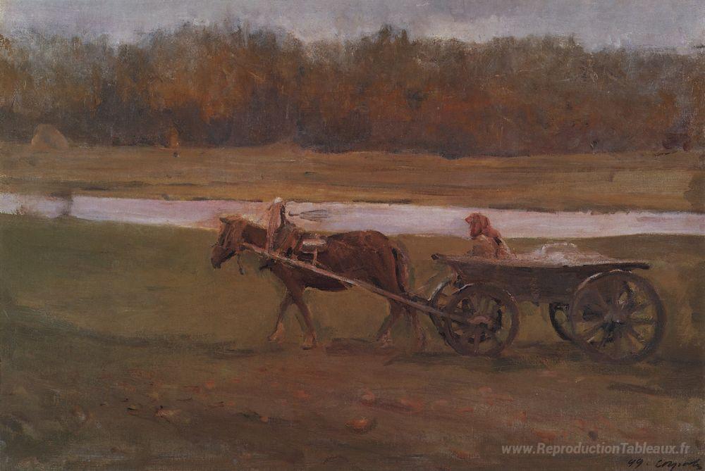 Nous vous proposons une reproduction artisanale sur toile du célèbre tableau 'Femme paysanne dans un chariot' de Valentin Serov, provenant du Musée de la Reproduction.
