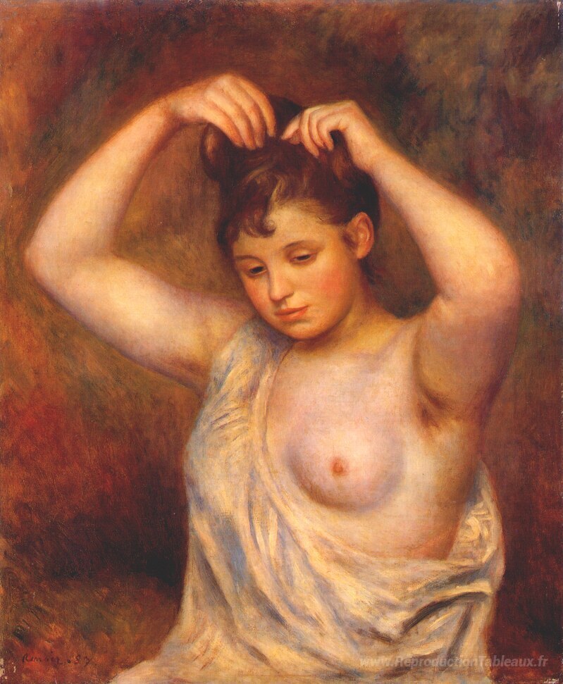 Nous vous proposons une reproduction artisanale sur toile du célèbre tableau 'Femme peignant ses cheveux' de Pierre-Auguste Renoir, provenant du Musée de la Reproduction.