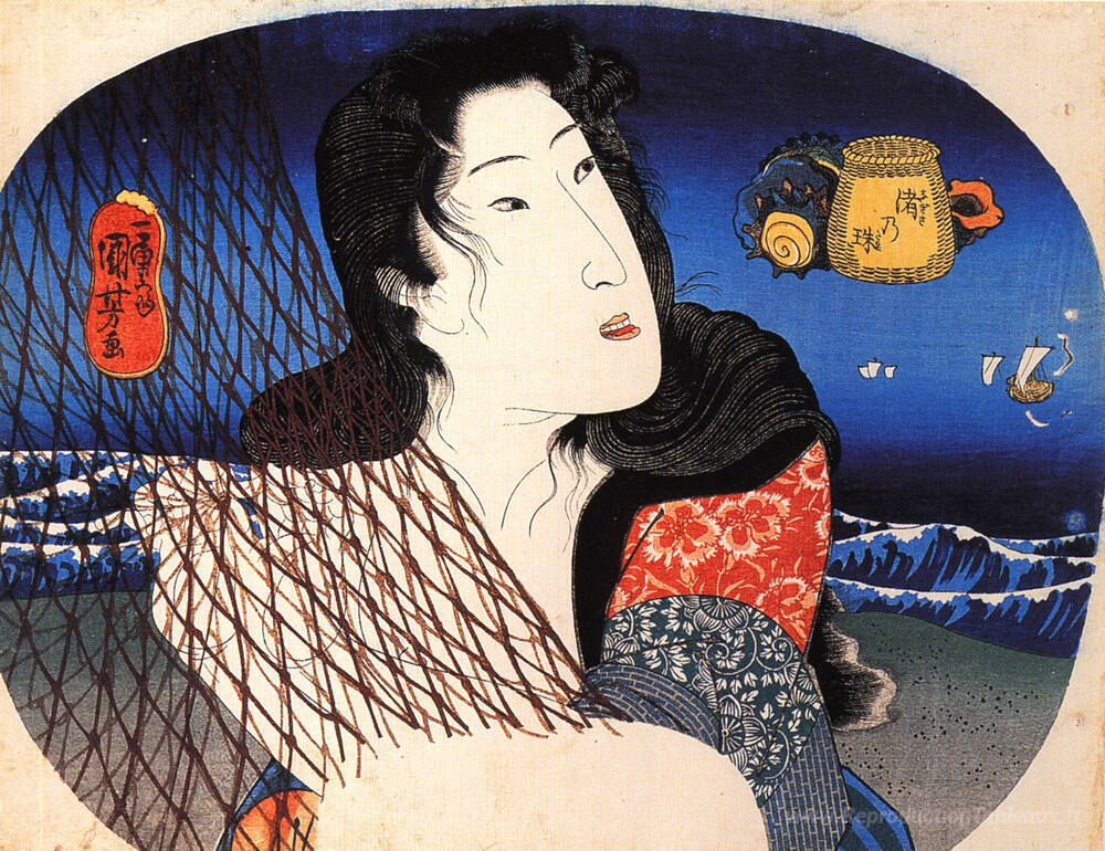 Nous vous proposons une reproduction artisanale sur toile du célèbre tableau 'Femme réparant un filet de poisson' de Utagawa Kuniyoshi, provenant du Musée de la Reproduction.
