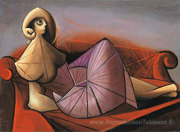 Nous vous proposons une reproduction artisanale sur toile du célèbre tableau 'Femme sur Divan' de Oscar Dominguez, provenant du Musée de la Reproduction.
