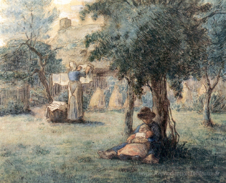 Nous vous proposons une reproduction artisanale sur toile du célèbre tableau 'Femme suspendue sa lessive' de Jean-Francois Millet, provenant du Musée de la Reproduction.