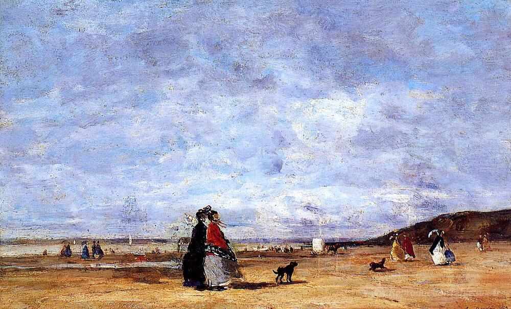 Nous vous proposons une reproduction artisanale sur toile du célèbre tableau 'Femmes élégantes sur la plage' de Eugene Boudin, provenant du Musée de la Reproduction.