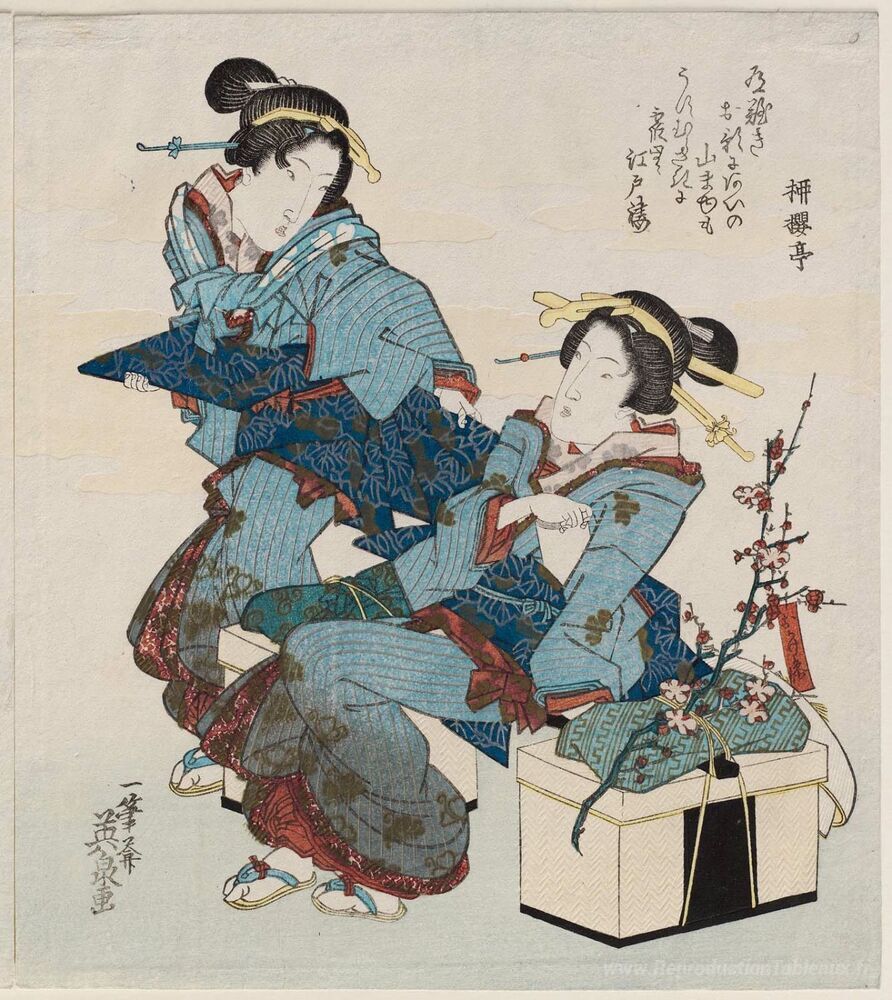 Nous vous proposons une reproduction artisanale sur toile du célèbre tableau 'Femmes en excursion' de Keisai Eisen, provenant du Musée de la Reproduction.