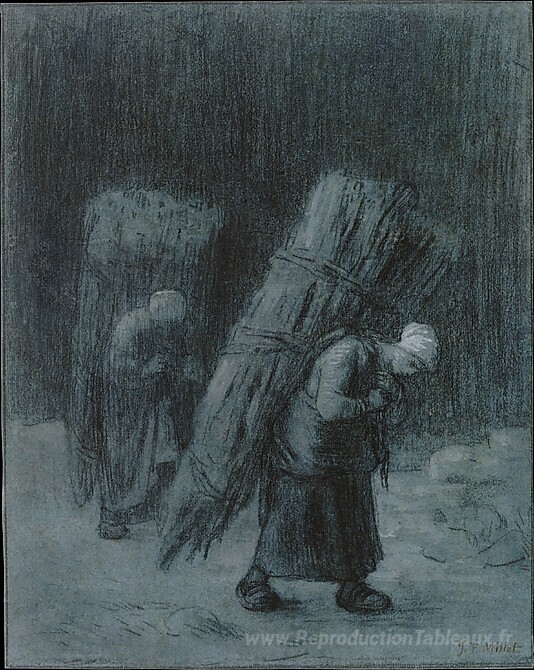 Nous vous proposons une reproduction artisanale sur toile du célèbre tableau 'Femmes portant des fagots' de Jean-Francois Millet, provenant du Musée de la Reproduction.