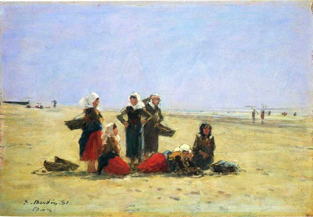 Nous vous proposons une reproduction artisanale sur toile du célèbre tableau 'Femmes sur la plage à Berck' de Eugene Boudin, provenant du Musée de la Reproduction.