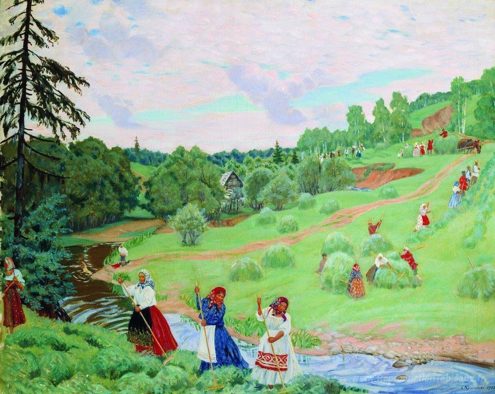Nous vous proposons une reproduction artisanale sur toile du célèbre tableau 'Fenaison' de Boris Kustodiev, provenant du Musée de la Reproduction.