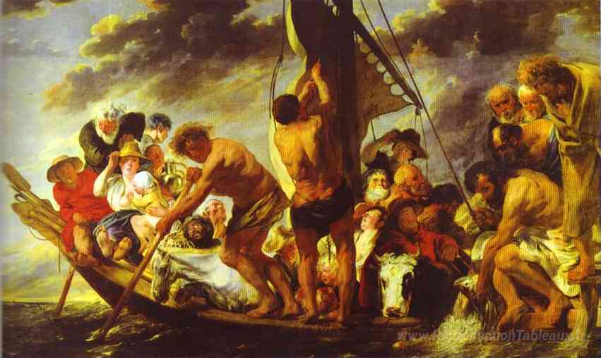 Nous vous proposons une reproduction artisanale sur toile du célèbre tableau 'Ferry-bateau à Anvers' de Jacob Jordaens, provenant du Musée de la Reproduction.