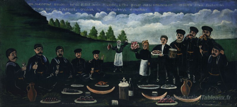 Nous vous proposons une reproduction artisanale sur toile du célèbre tableau 'Festival de Pâques' de Niko Pirosmani, provenant du Musée de la Reproduction.