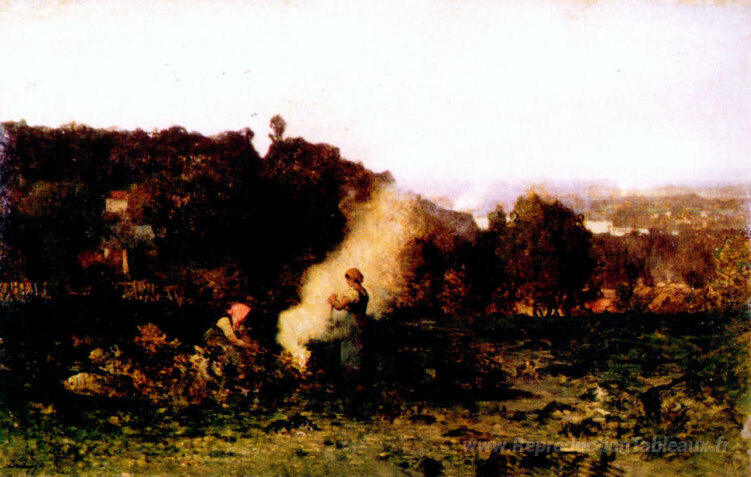 Nous vous proposons une reproduction artisanale sur toile du célèbre tableau 'Feu de bois dans le pays' de Charles-Francois Daubigny, provenant du Musée de la Reproduction.
