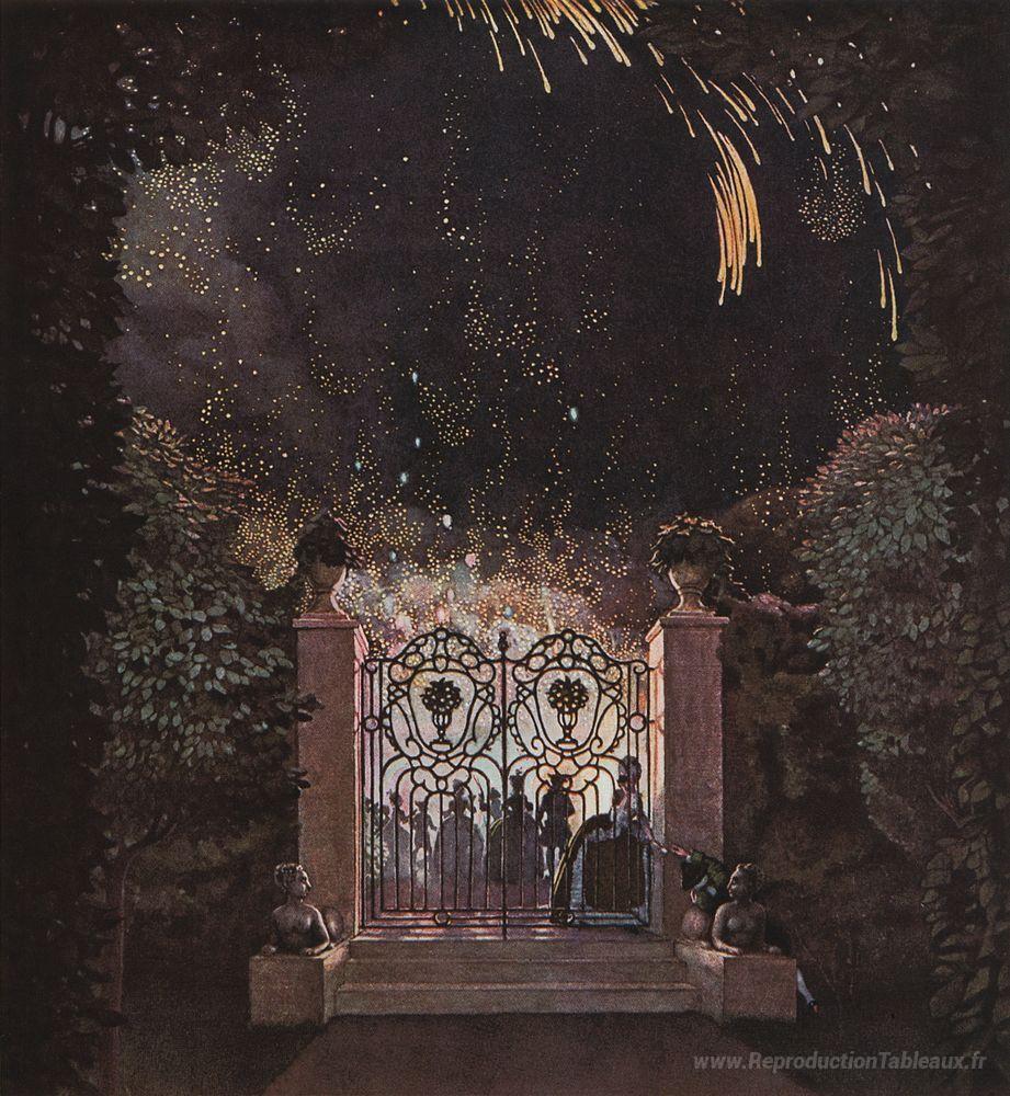 Nous vous proposons une reproduction artisanale sur toile du célèbre tableau 'Feux d'artifice dans le parc' de Konstantin Somov, provenant du Musée de la Reproduction.
