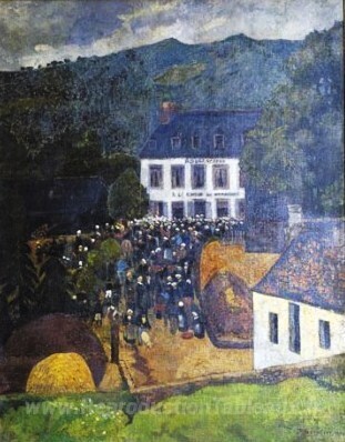 Nous vous proposons une reproduction artisanale sur toile du célèbre tableau 'Fiera di Chateauneuf du Faou' de Paul Serusier, provenant du Musée de la Reproduction.