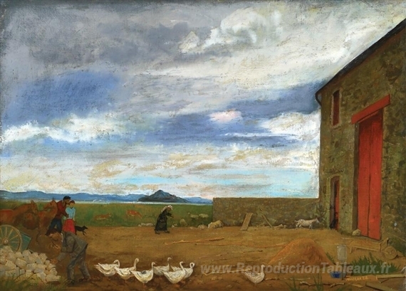 Nous vous proposons une reproduction artisanale sur toile du célèbre tableau 'Figures dans le village' de Grégoire Michonze, provenant du Musée de la Reproduction.