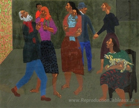 Nous vous proposons une reproduction artisanale sur toile du célèbre tableau 'Figures dans une pièce' de Grégoire Michonze, provenant du Musée de la Reproduction.