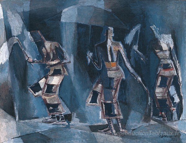 Nous vous proposons une reproduction artisanale sur toile du célèbre tableau 'Figures sénégalaises dansantes' de Gerard Sekoto, provenant du Musée de la Reproduction.