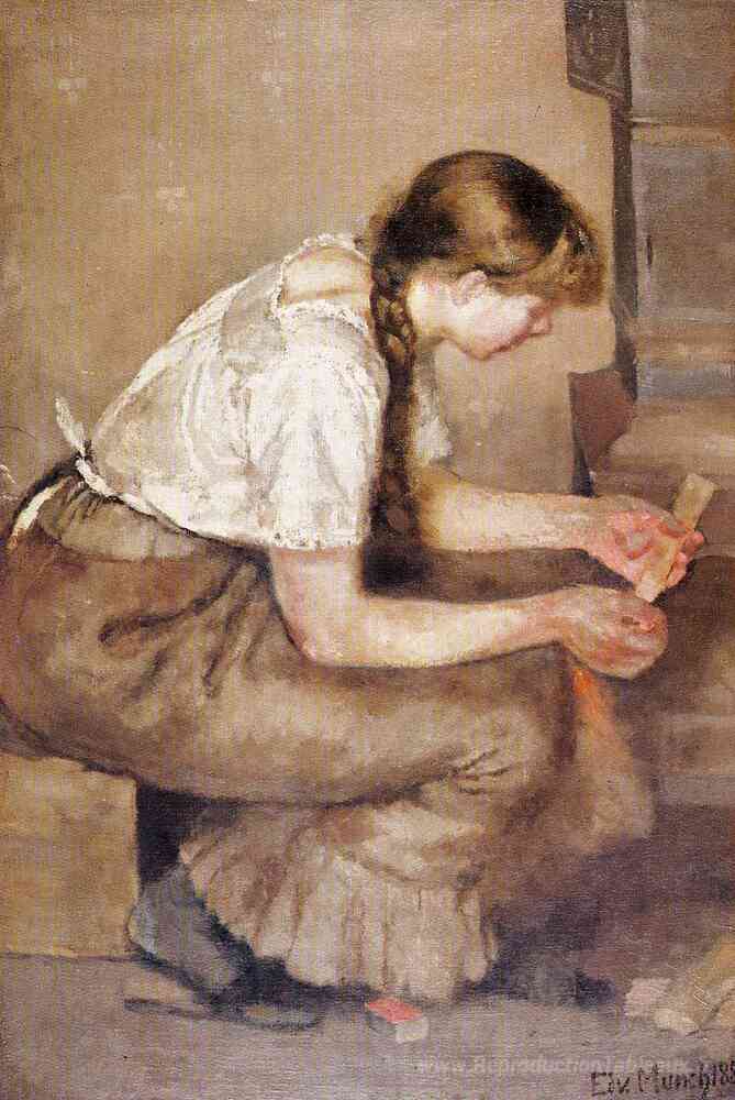 Nous vous proposons une reproduction artisanale sur toile du célèbre tableau 'Fille allume un poêle' de Edvard Munch, provenant du Musée de la Reproduction.